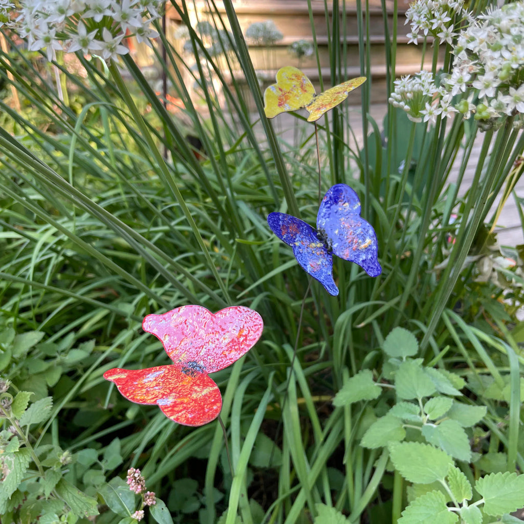 Bring a touch of color and movement to your garden, patio, or planters with these copper enamel butterflies. Each piece features a 2.5" diameter butterfly on an 18" stick, designed to catch the light breeze and create a subtle, eye-catching accent. With 6 assorted colors per minimum order, these pinwheels are a charming way to brighten any outdoor or indoor space.